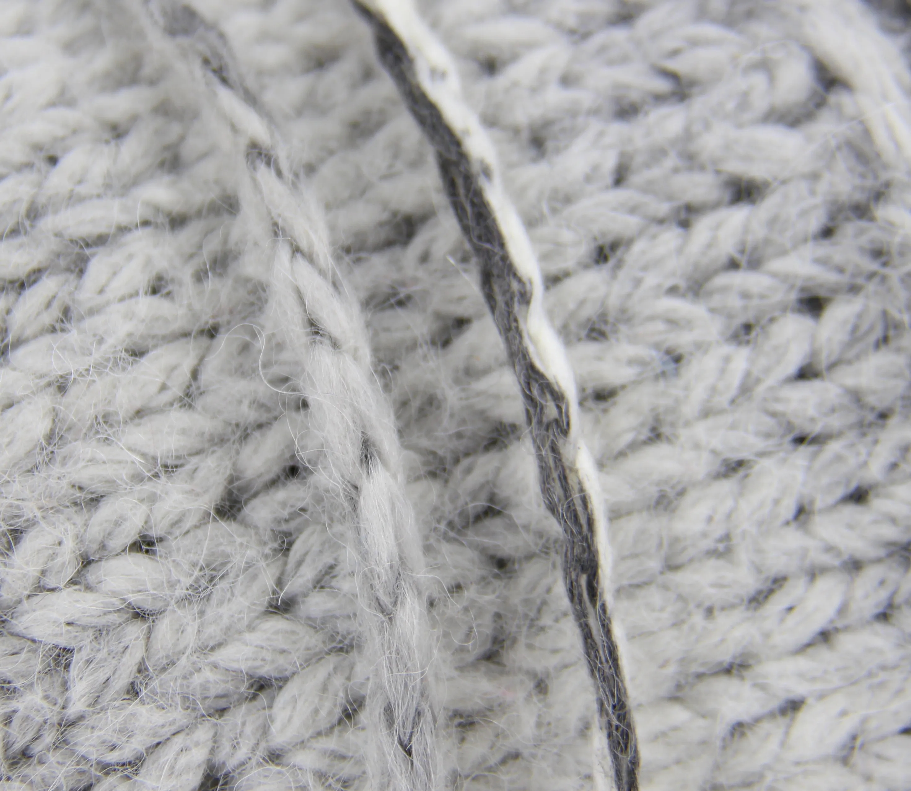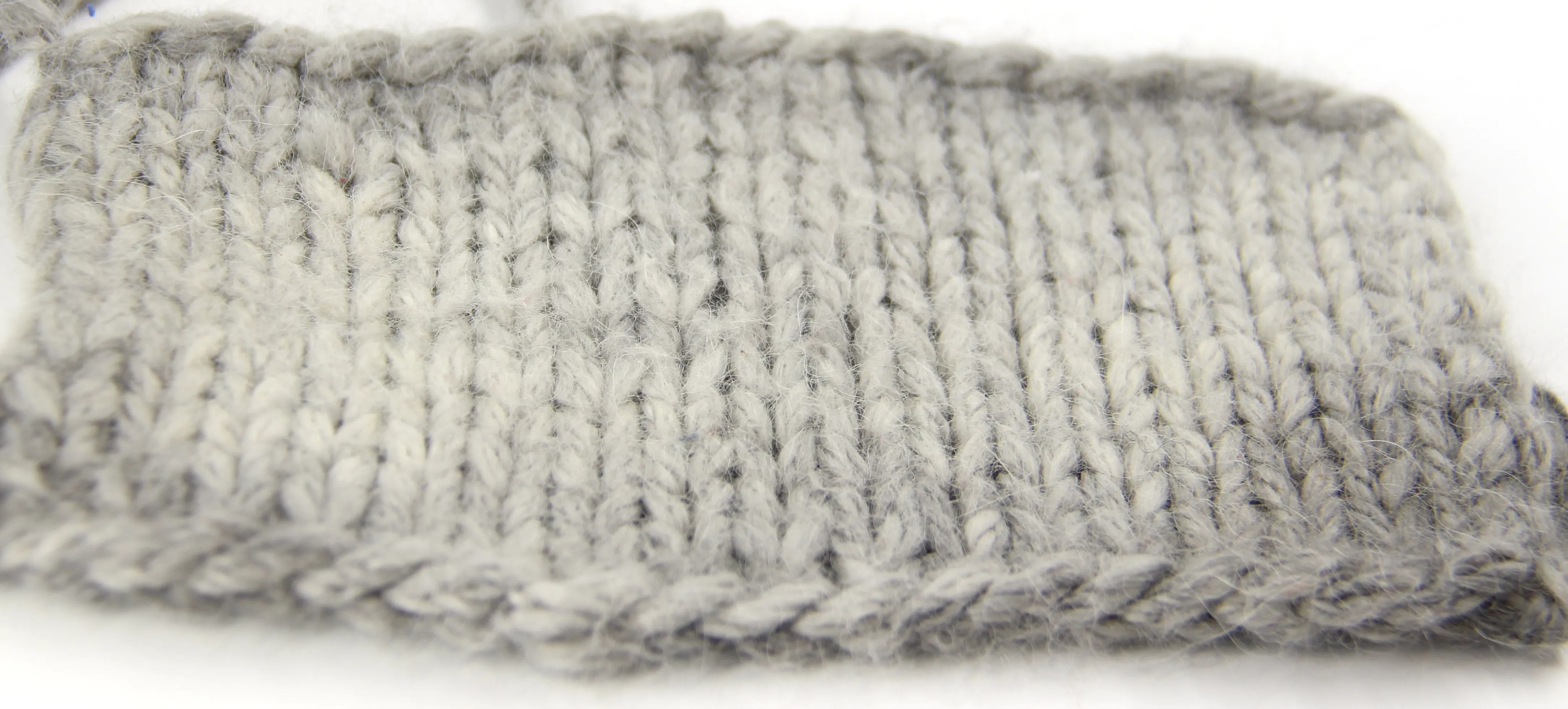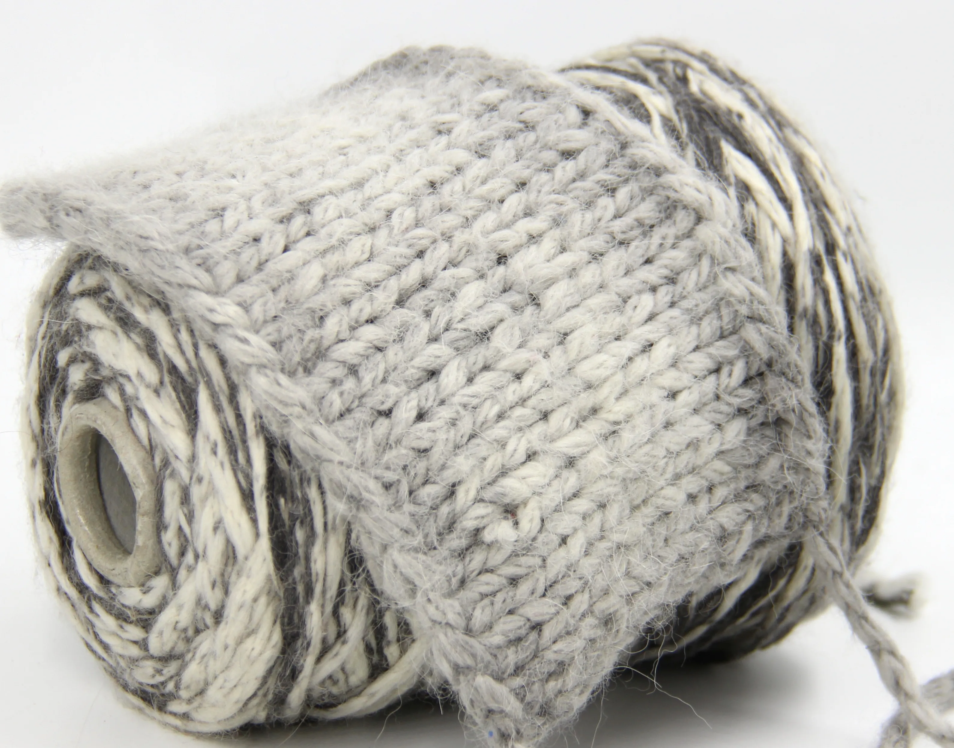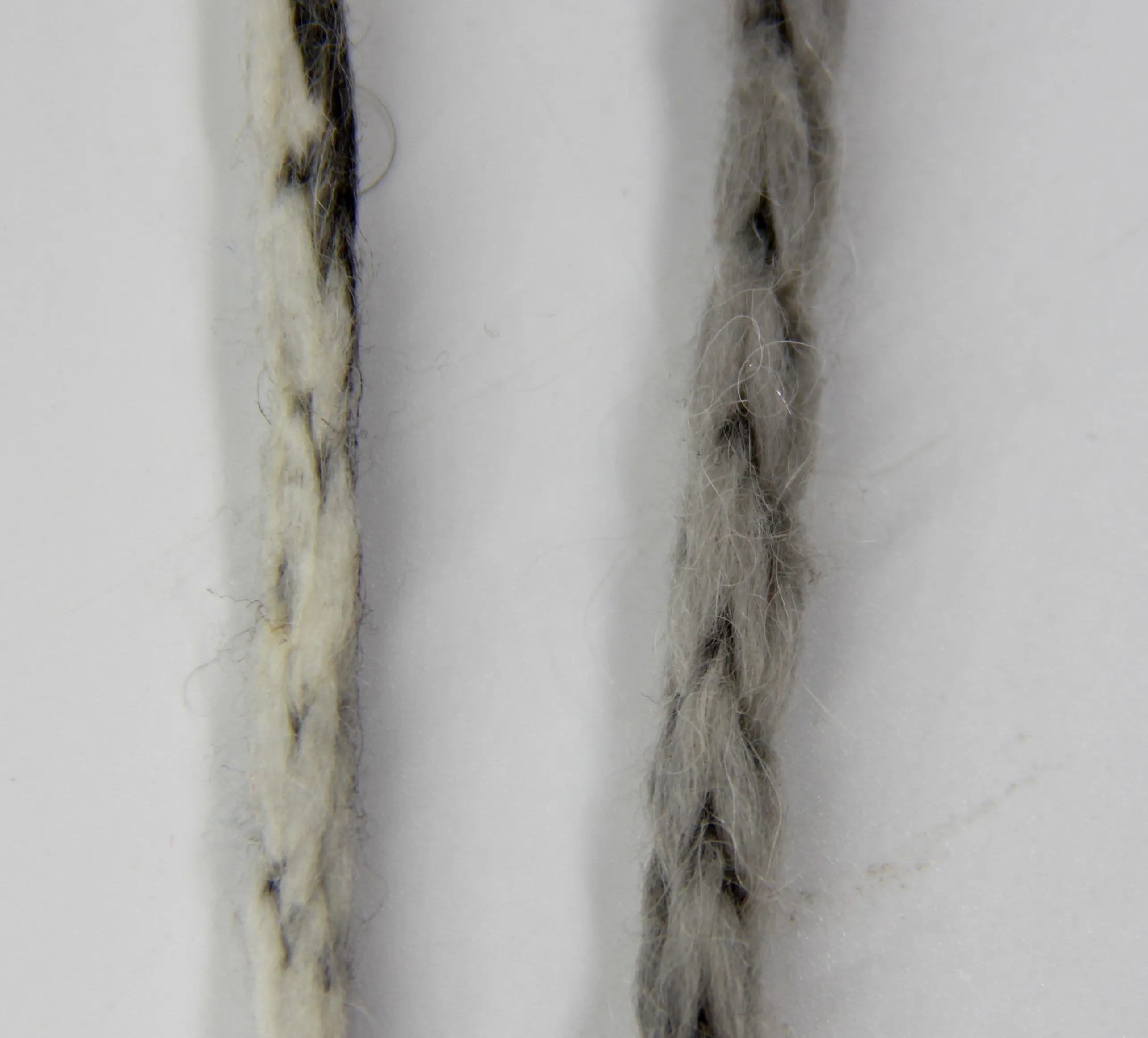 Во время стирки краска смывается, и получается дымчато серое полотно, но предполагаем, что после многочисленных  стирок получится совсем белое полотно. Пряжа очень сильно разбухает, на фото видно, как шнурок увеличился почти в 2 раза. Идеально подойдет для зимних пальто, кардиганов